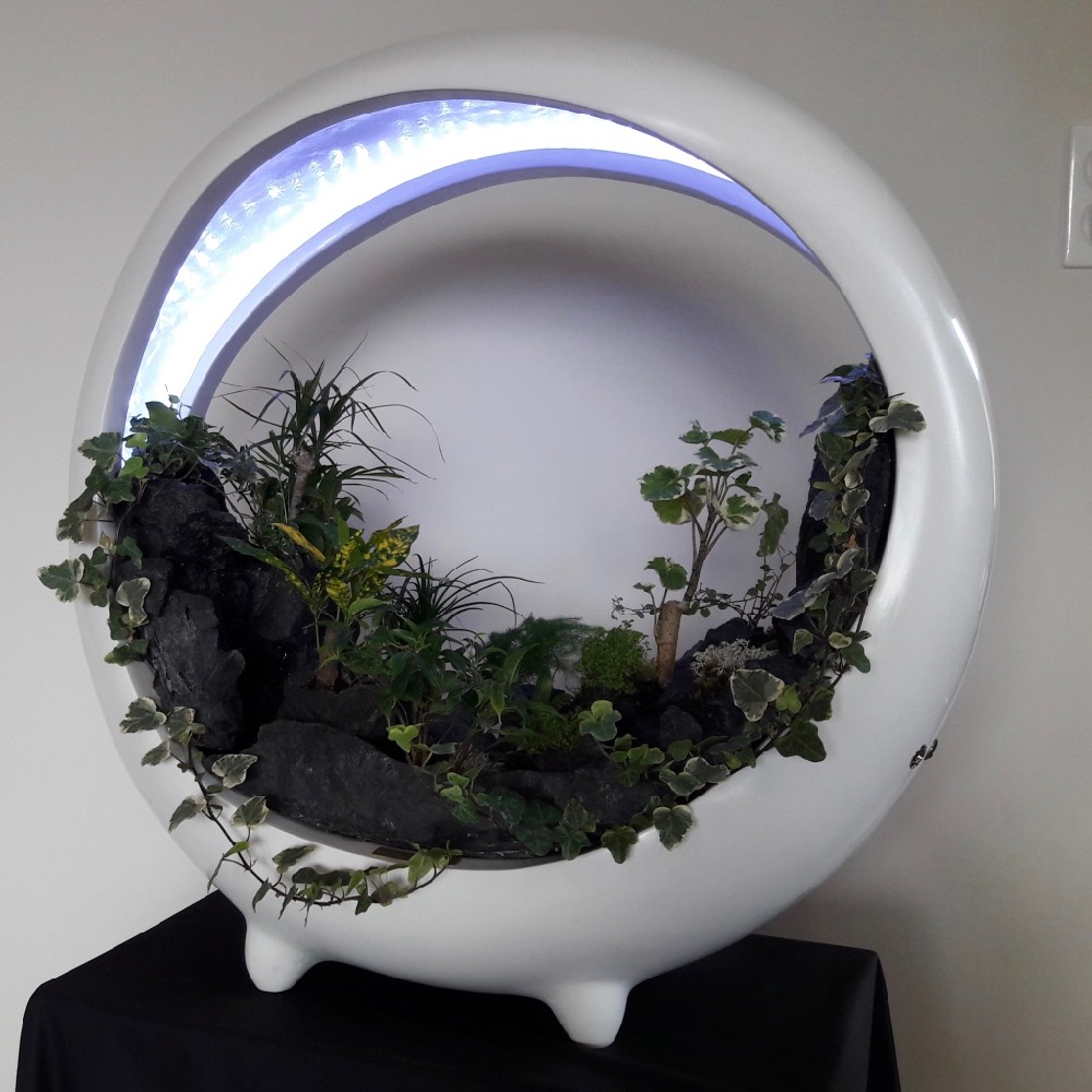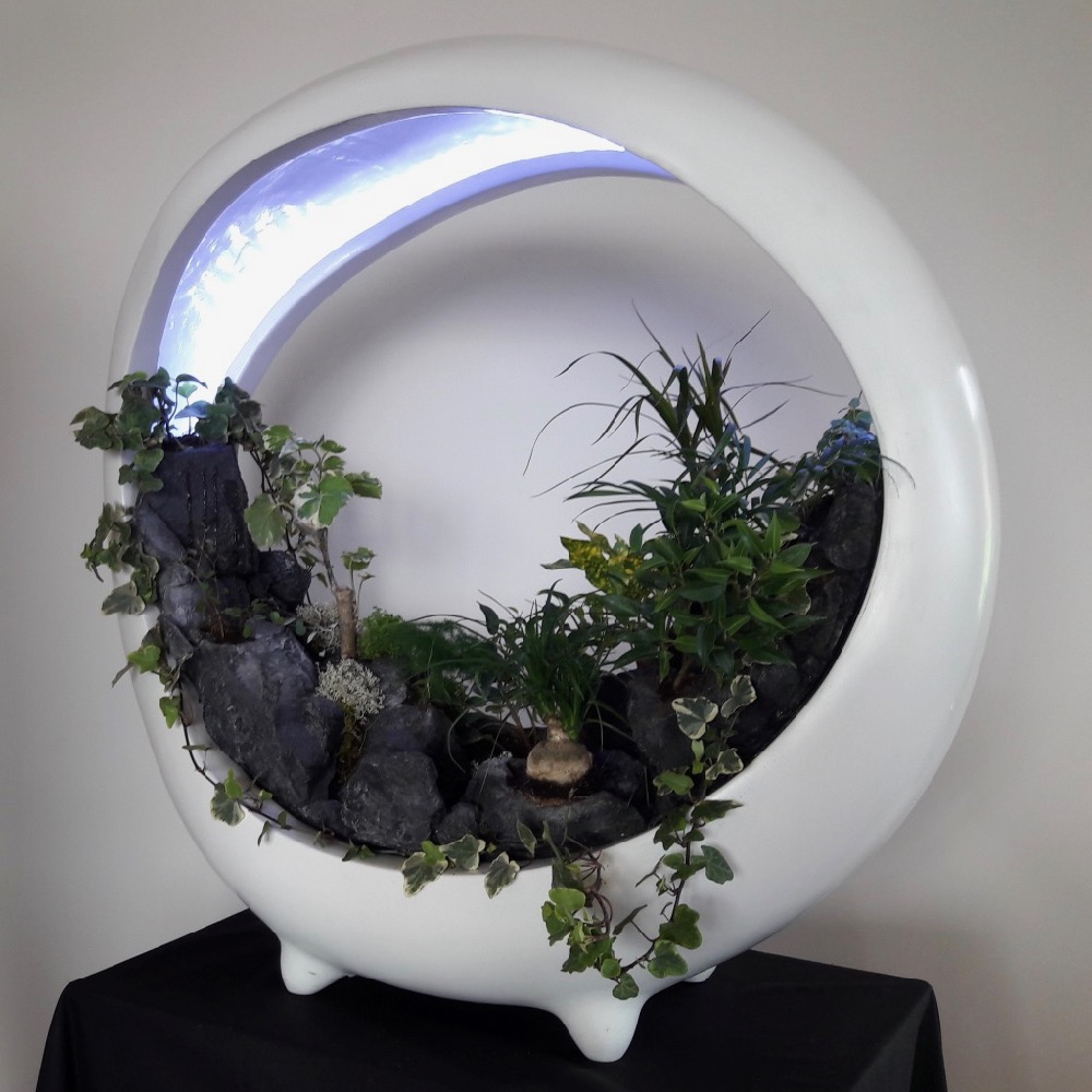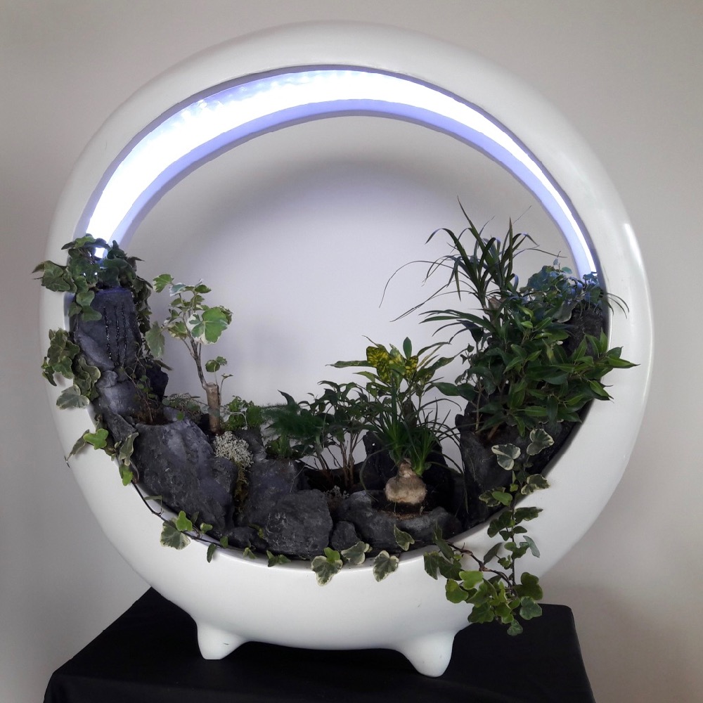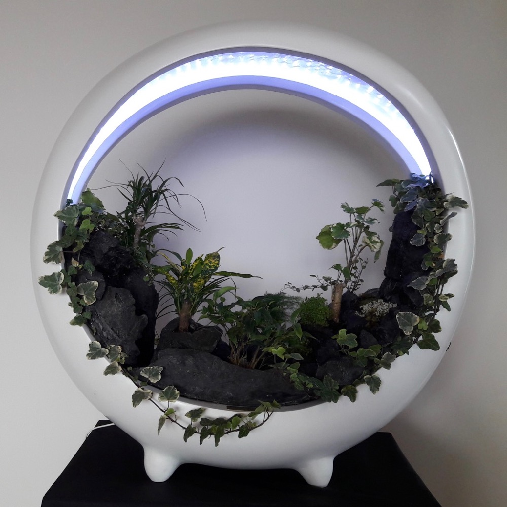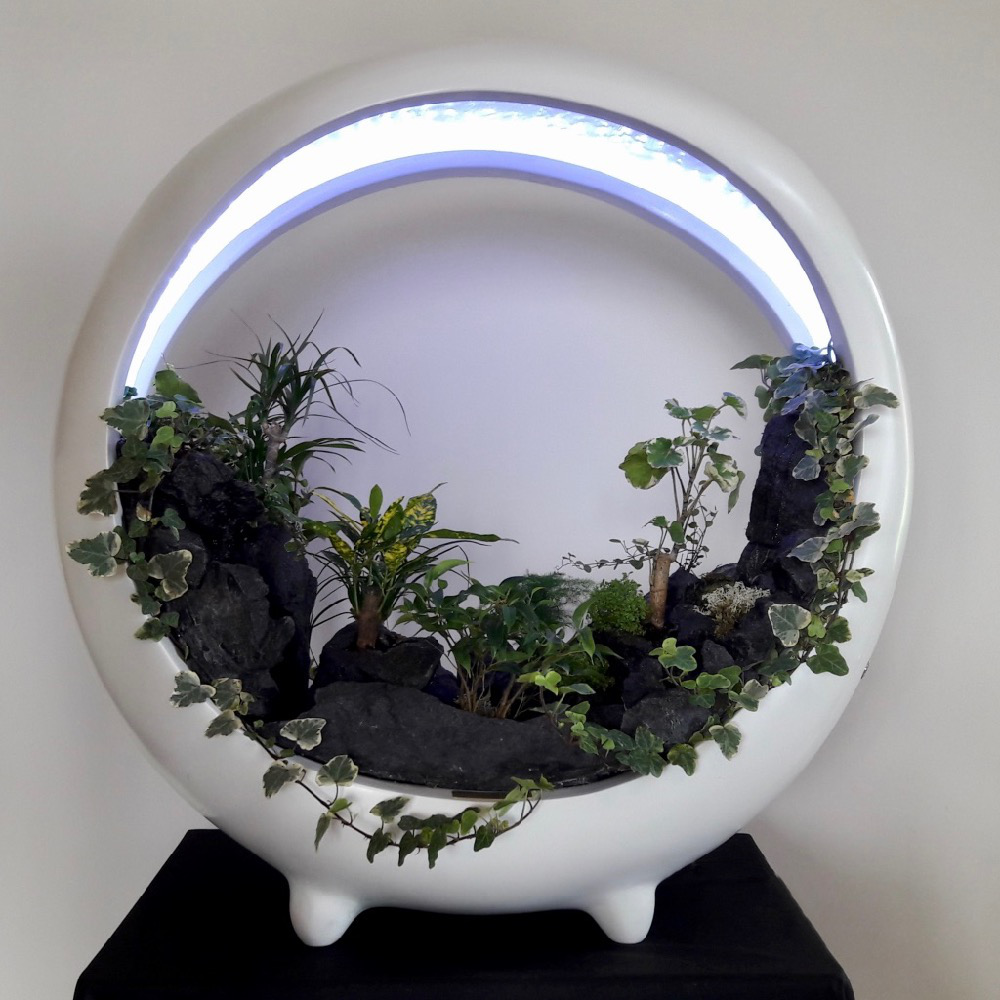 In the spirit of vegetal walls, sumptuous miniature landscape with rivers, lacs, cascades, forest… surrounded by mist