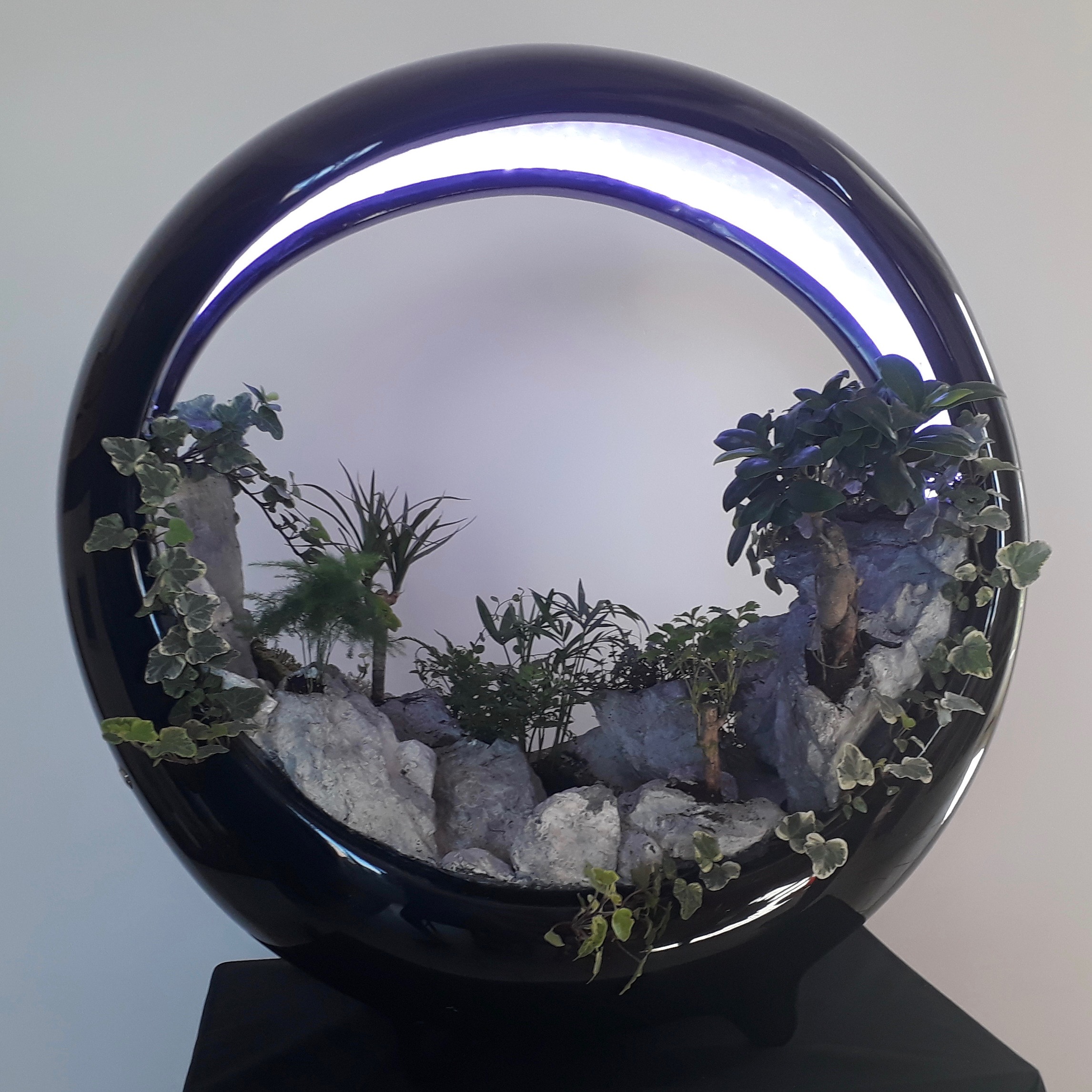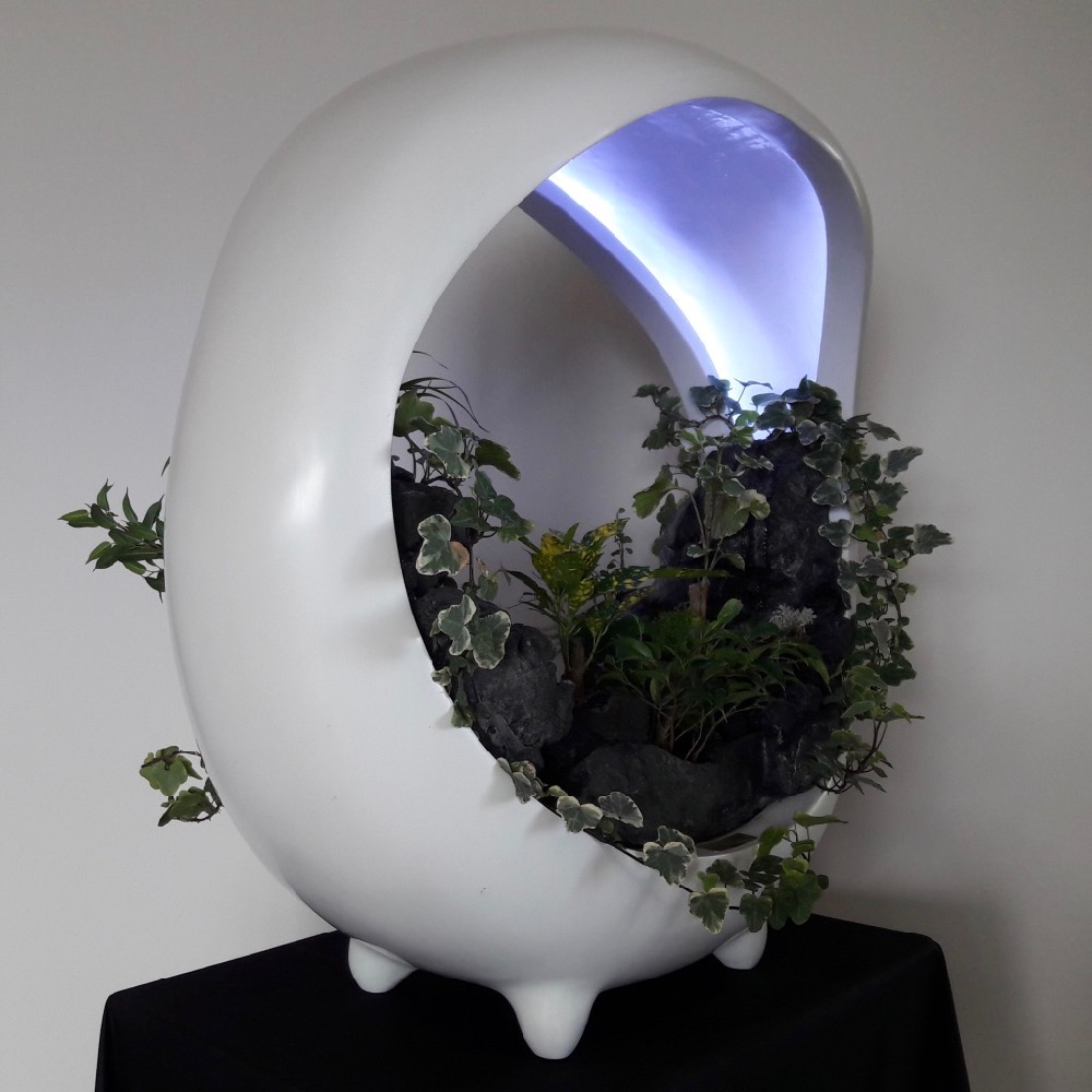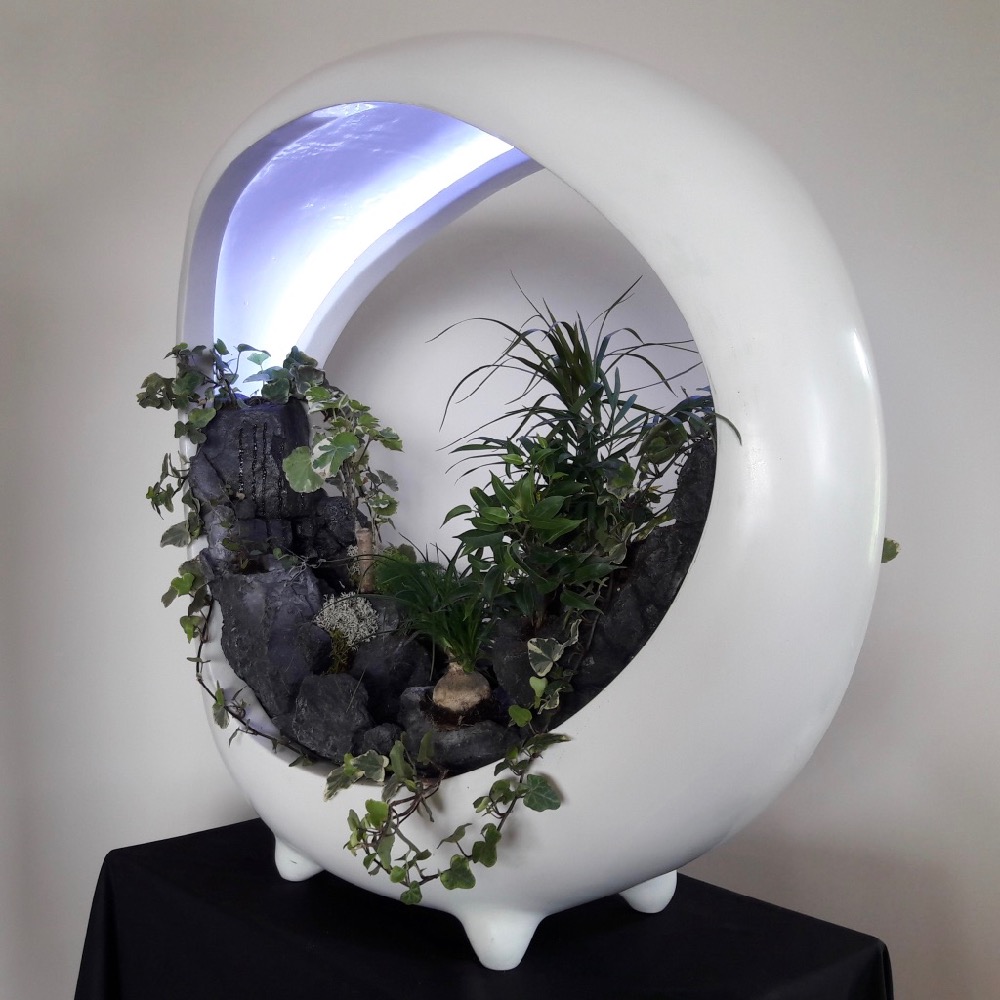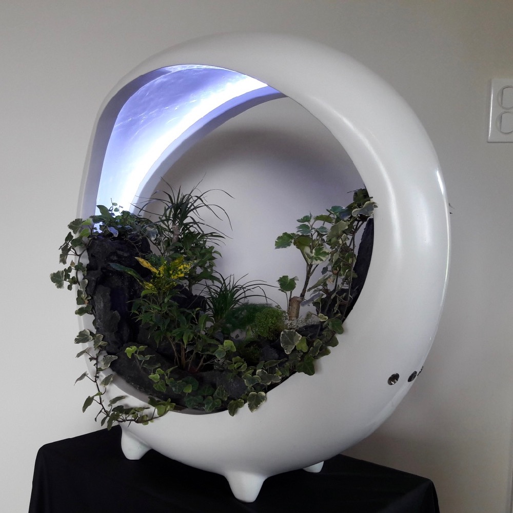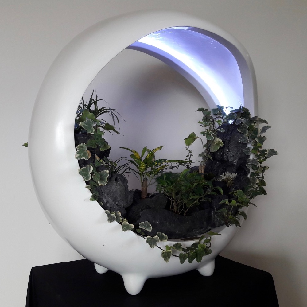 In the spirit of vegetal walls, sumptuous miniature landscape with rivers, lacs, cascades, forest… surrounded by mist